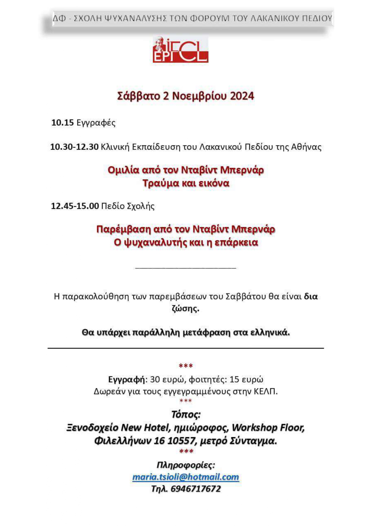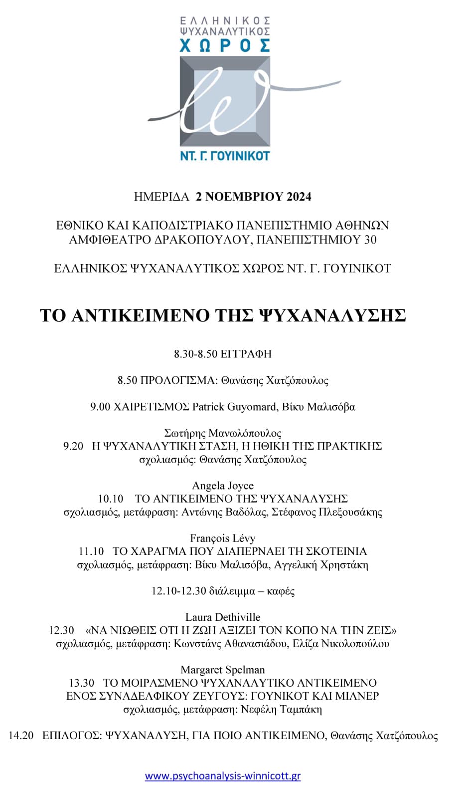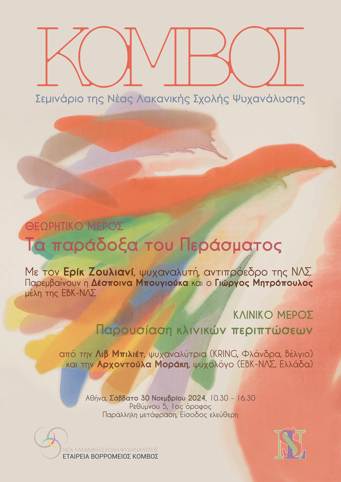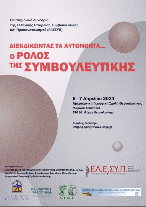 Σάββατο 06/04/2024 Συνέδριο της Ελληνικής Εταιρείας Συμβουλευτικής και Προσανατολισμού (ΕΛ.Ε.ΣΥ.Π.) Συμμετοχή στο στρογγυλό τραπέζι "Συμβουλευτική και Ψυχαναλυτική Πράξη: Μια Γόνιμη Συνάρθρωση", με την εισήγηση: "Η επιθυμία για γνώση" Έλενα Διέτη |