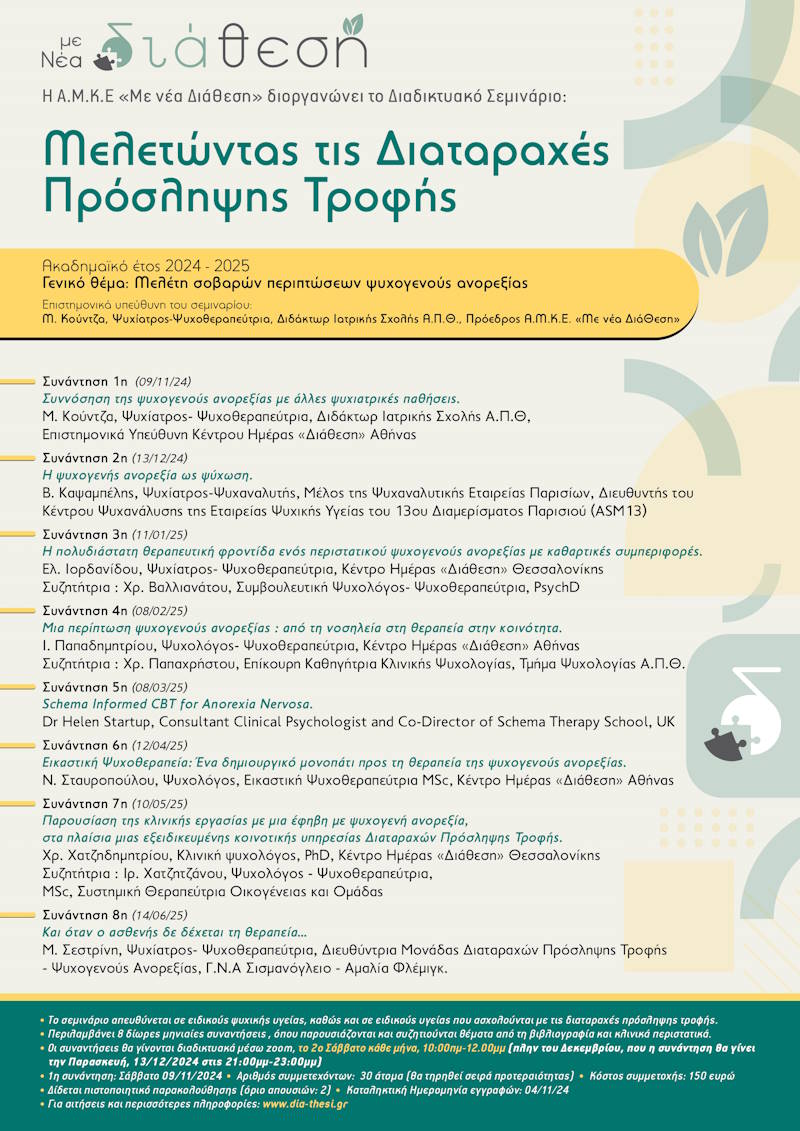 Σάββατο 14/09/2024 1ο Πανελλήνιο Συνέδριο για τις Διαταραχές Πρόσληψης Τροφής Συμμετοχή με την εισήγηση: "Συναισθηματικές αποκρίσεις, εκφραζόμενο συναίσθημα και συμβιβαστικές συμπεριφορές σε μητέρες και πατέρες ασθενών με διαταραχή πρόσληψης τροφής" Μ. Τσιάκα, E. Διέτη, Ρ. Κωστή, Φ. Μπονώτη |